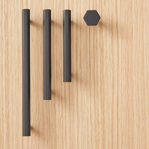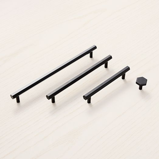Shown in Alden 6", 4", 3" Hexagon Pulls and Knob, Antique Brass