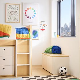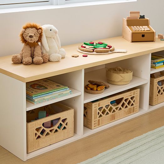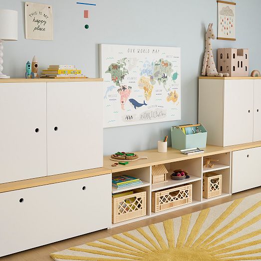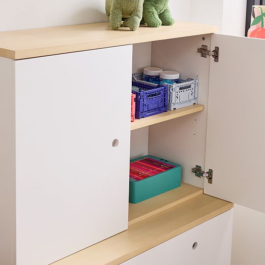 • Tall Play Storage Cabinet: 2 doors open to reveal adjustable shelves.