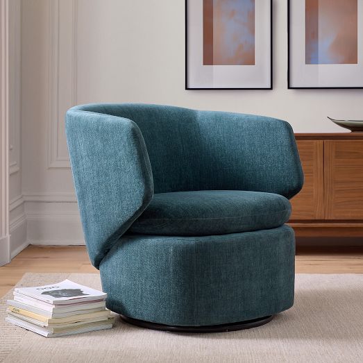 We love the wraparound comfort of our modern Crescent Swivel Chair. A contemporary update to the classic drum chair, it's great for TV viewing and easy conversation. Its durable, contract-grade frame comes covered in top-grain leather.