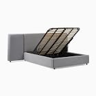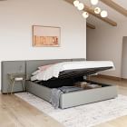 Mattress platform lifts easily via a cord (at foot of bed) and gas-lift mechanism that stays elevated until pulled back down.