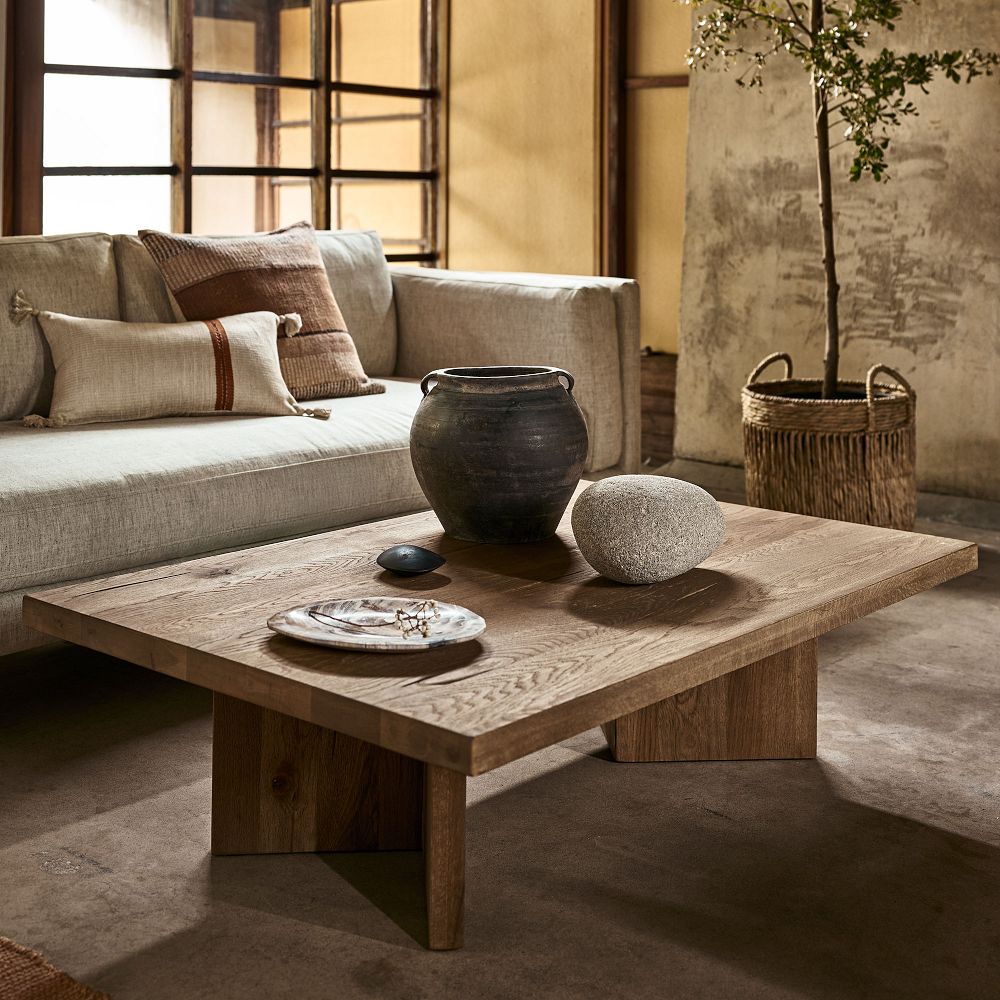 Inverted plank legs and a slab top give our rustic Devon Coffee Table a little something special. It's made from solid oak wood covered in a weathered finish for a rustic, cabin-like look.