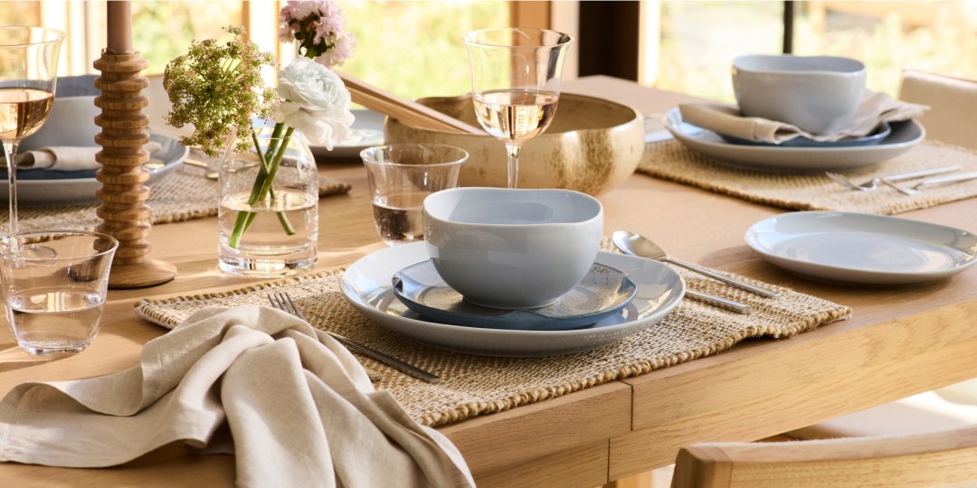 Fluid shapes and woven accents form a refined yet grounded table setting.