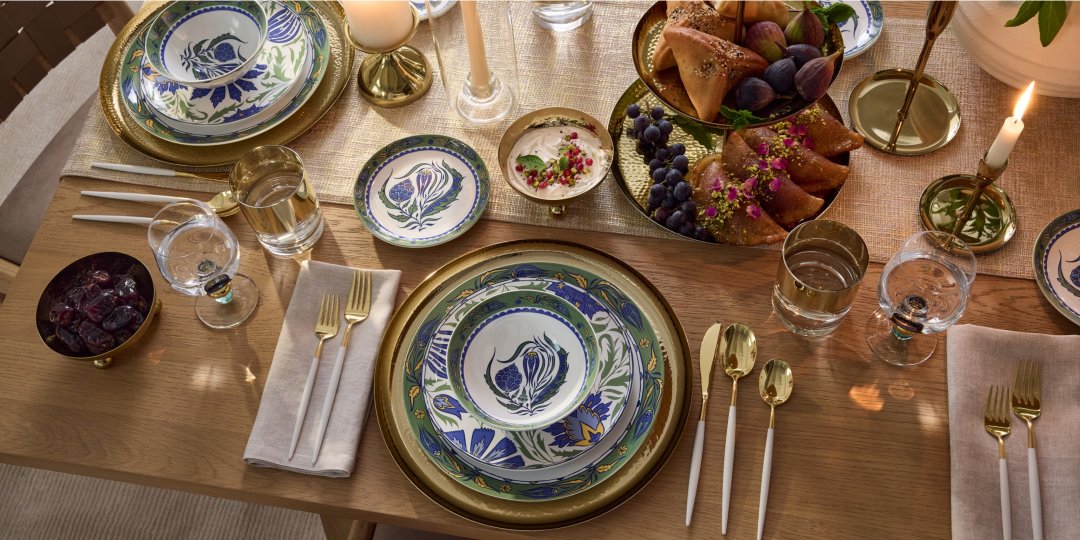 Ornate plates, gilded finishes and rich textures create a tablescape perfect for Eid.
